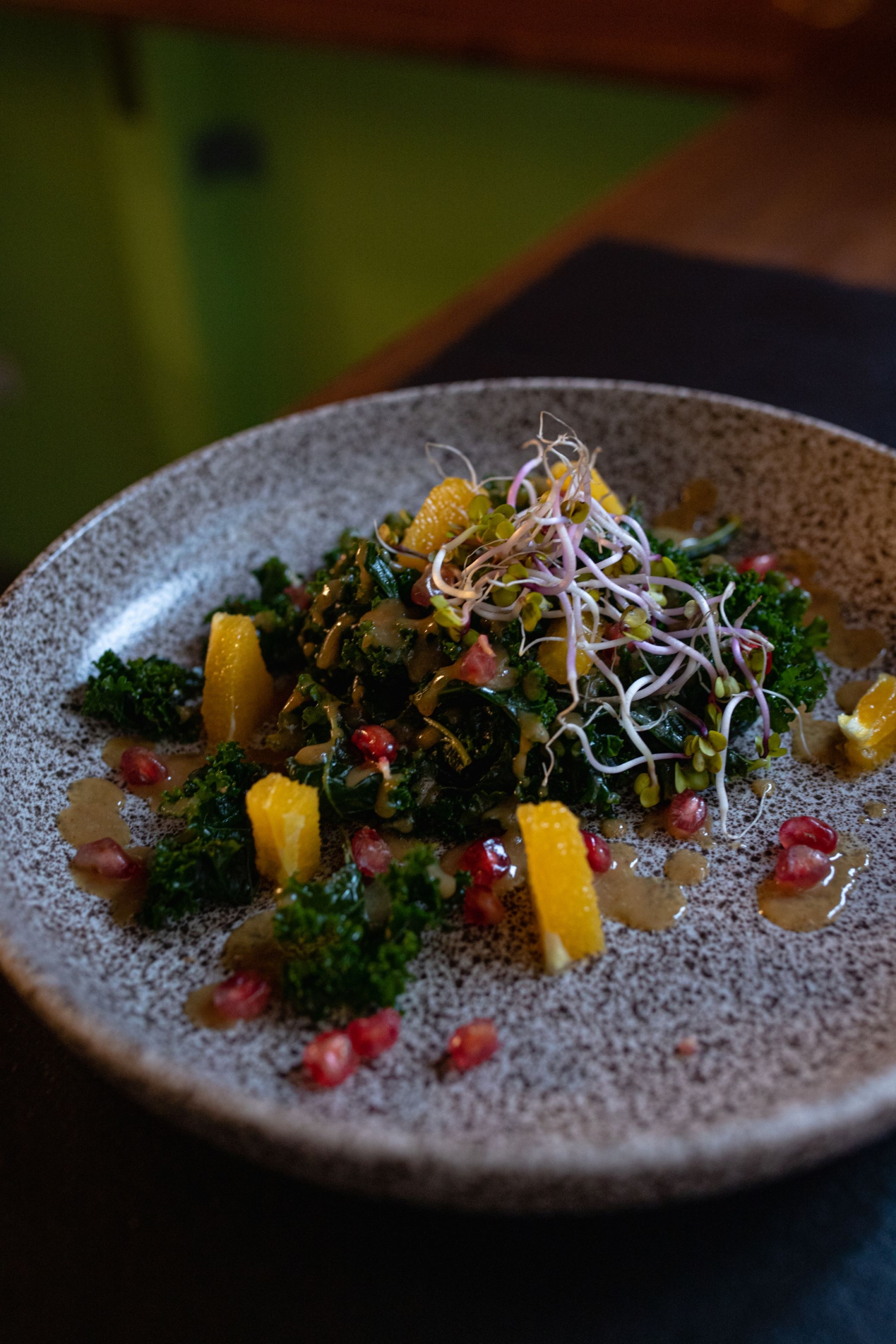Du darfst den Braten zu einem veganen Bio-Weihnachtsmenü upgraden. Bestelle dir als Vorspeise Grünkohlsalat mit Orangen-Schnitzen, Granatapfelkernen, Sprossen und Birne-Chai-Dressing dazu. Außerdem bekommst du von uns karamellisiertes Ofengemüse (aus Möhren, Champignons, Birnen, Feigen und Schalotten) und klassisches Apfel-Rotkraut. Als Abschluss gibt’s Schoko-Mousse mit Vanille-Chai-Creme zum Dessert.