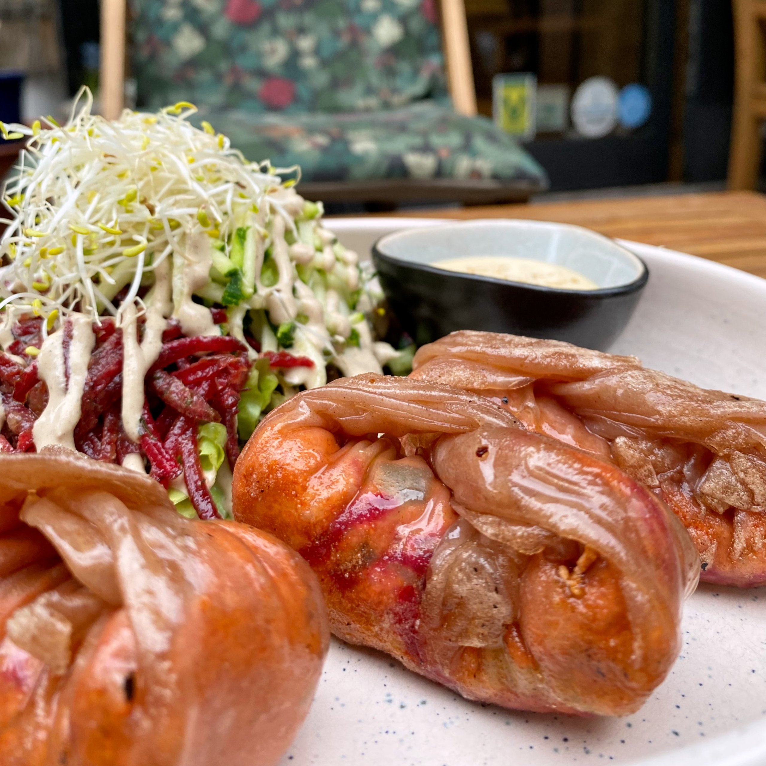 glutenfreie Dumplings aus Reispapier mit Kimchi-Tofu-Füllung, Sesam-Miso-Mayo und Beilagensalat