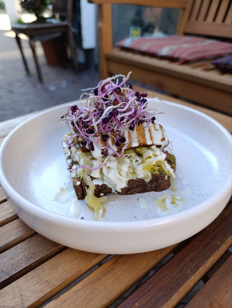 glutenfreies Buchweizenbrot mit Spinathummus, selbstgemachtem Sauerkraut, knusprigem Räuchertofu, Cashew-Sour Cream und Sprossen