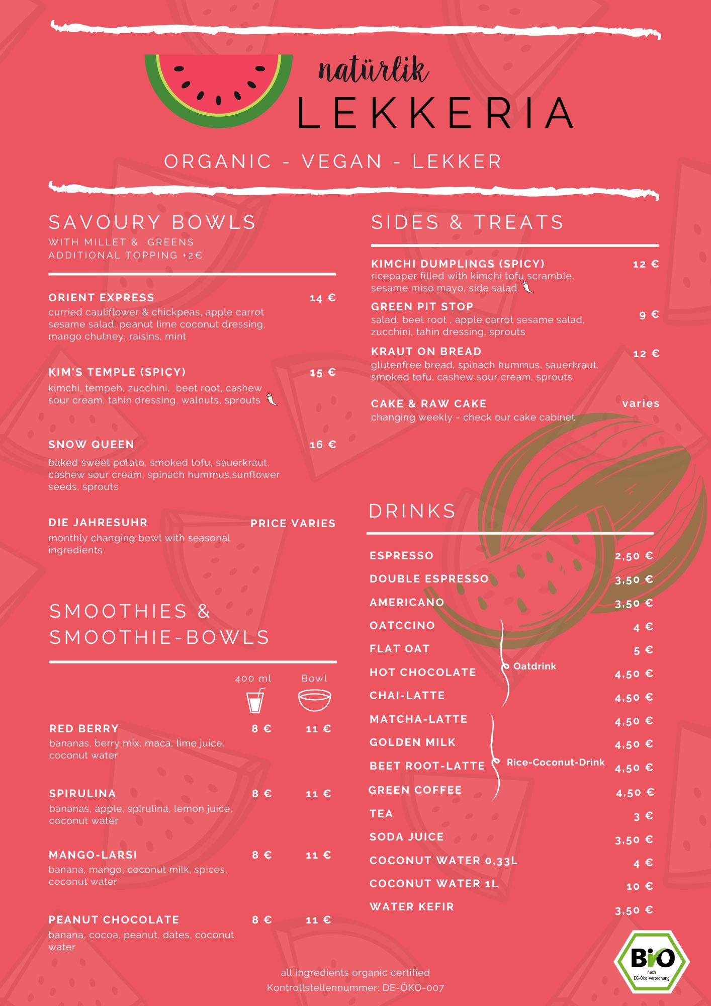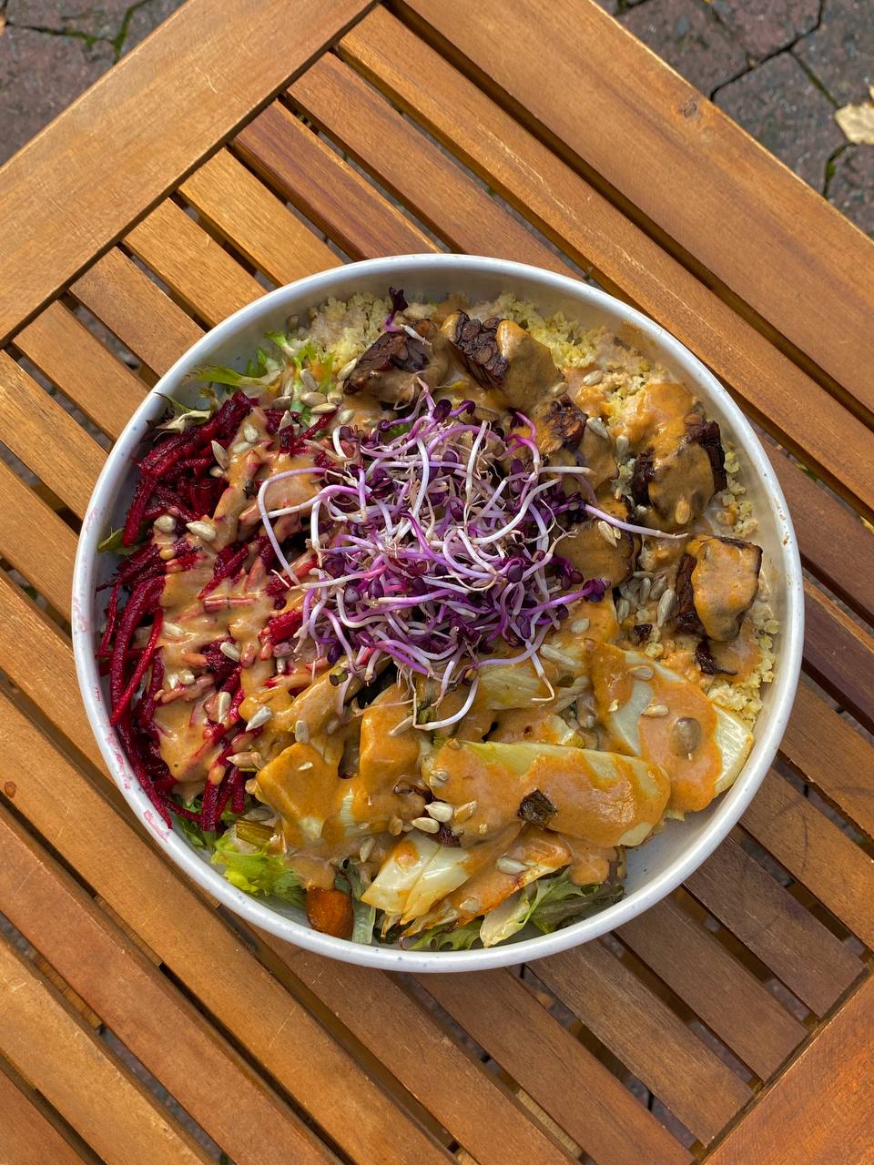 Grünzeug, Hirse, marinierter Ofenkürbis mit Räuchertofu, rotes Sauerkraut, Zucchini, Tahin-Soße, Beeren-Chili-Soße, geröstete Kürbiskerne, Sprossen